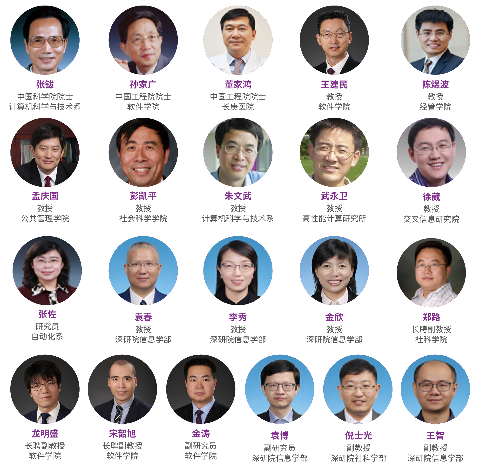 自项目成立以来,已有来自校内不同院系大数据技术与应用领域的院士、教授及专家学者50余位担任校内项目指导老师,其中包括软件学院孙家广院士、计算机系张钹院士、临床医学院董家鸿院士。多位学科带头人承担项目课程教学任务,其中包括《大数据系统基础(B)》授课老师——王建民教授(软件学院);《大数据分析(B)》授课老师——朱文武教授(计算机系);《大数据管理与创新》授课老师-陈煜波教授(经管学院);《数据思维与行为》授课老师——彭凯平教授(社科学院)等。这些专家学者为项目人才培养提供权威学术指导。